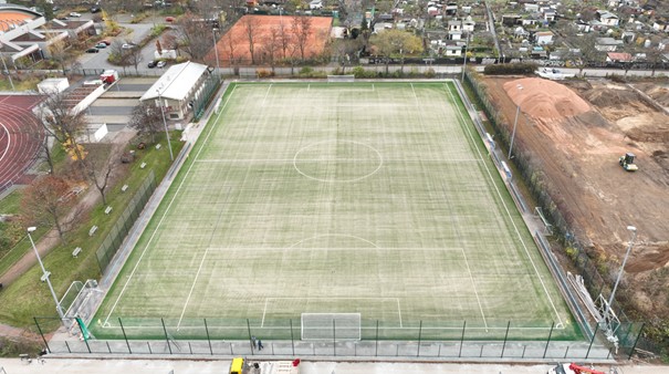 Seit Ende August wurde das bisherige Tennenspielfeld in ein modernes Kunstrasengroßfeld umgewandelt. Dabei wurde der alte Belag abgetragen, eine Elastikschicht aufgebracht und darauf der neue Kunstrasen verlegt. Der etwa 6200 Quadratmeter große Platz besteht aus zweifarbigen, geraden und gekräuselten Fasern und wurde mit 155 Tonnen Sand verfüllt – rund 25 Kilogramm pro Quadratmeter.