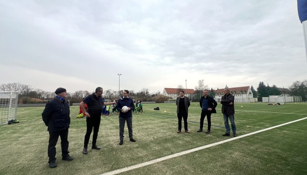 Sportbürgermeister Jan Donhauser und der Eigenbetrieb Sportstätten nutzten die Gelegenheit, den Platz offiziell an den Sportverein Sachsenwerk zu übergeben. Die STESAD als Projektleiter des Neubaus war ebenfalls vertreten.