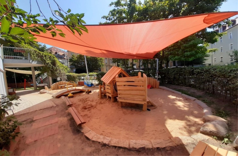 - Beim „Fröbel-Kinderhaus“ an der Rosa-Menzer-Straße wurden die Außenbereiche mit zusätzlichen Schattenspendern, Bepflanzung und Sitzmöglichkeiten aufgewertet.