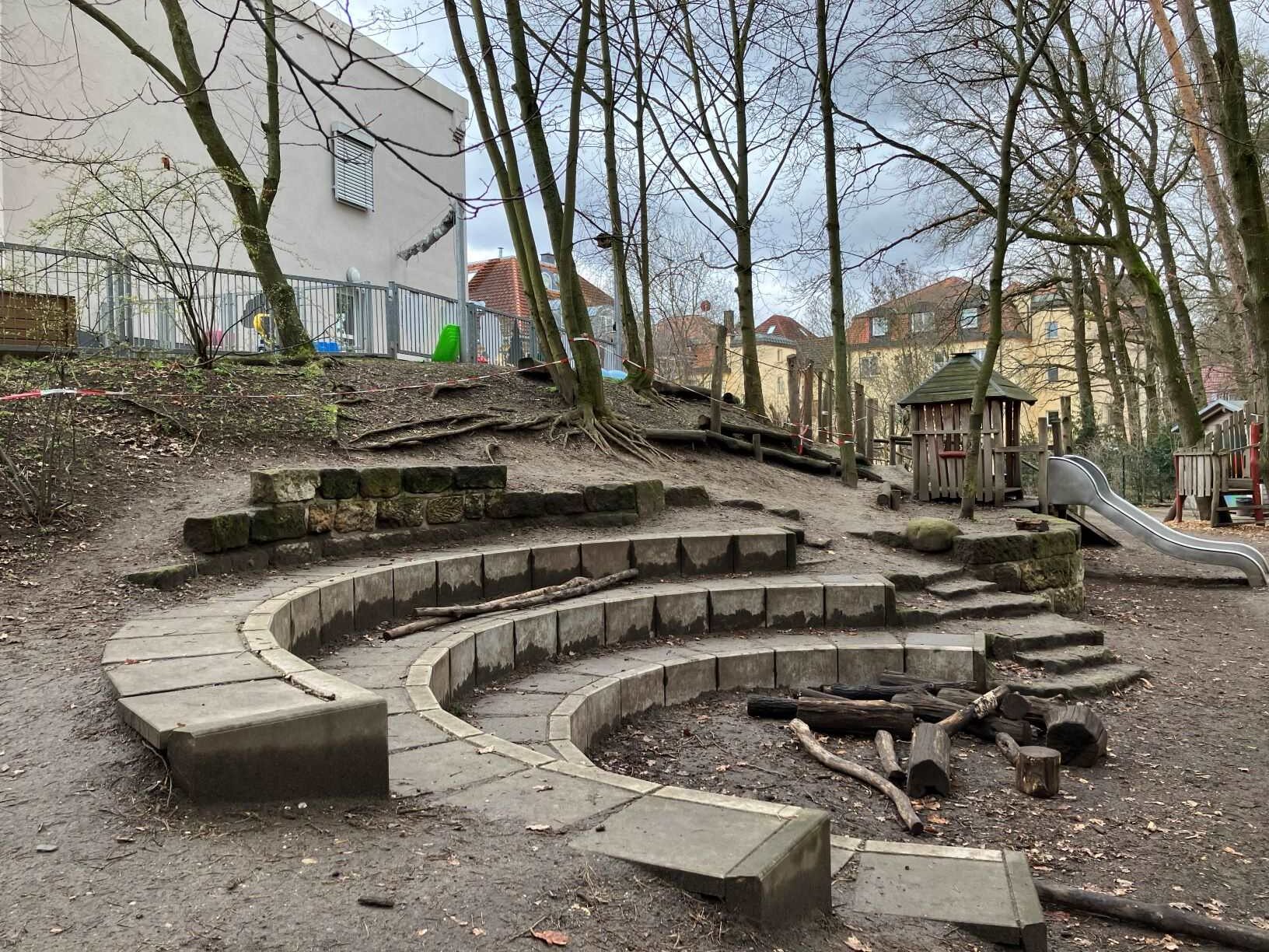 - Die „Theos Integrations-Kita“ an der Theodor-Fontane-Straße erhielt durch kreative Holzelemente, Terrassierungen und Sträucher eine natürliche Hanggestaltung, die Spiel- und Rückzugsräume verbindet.